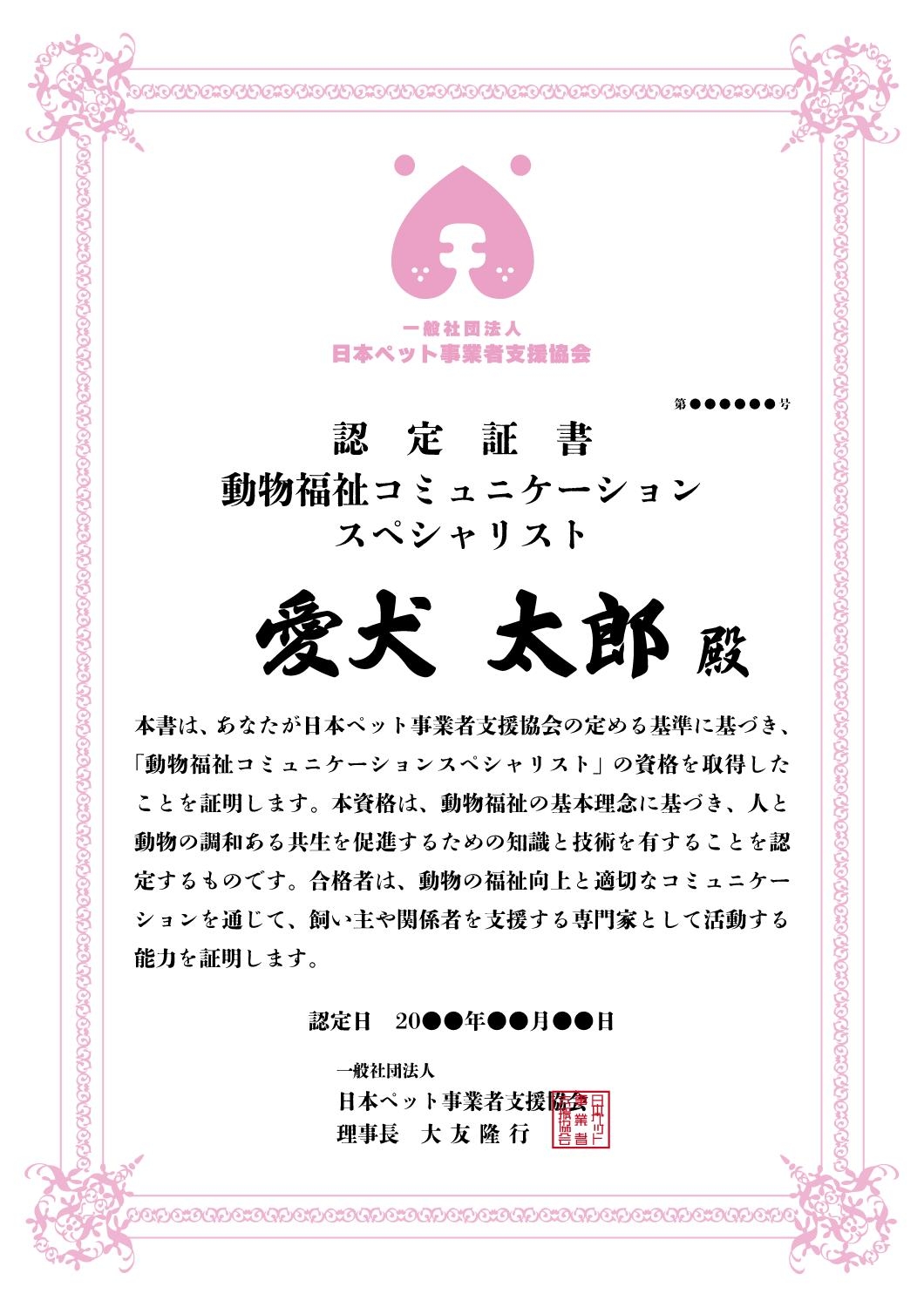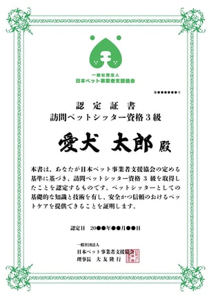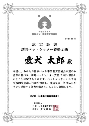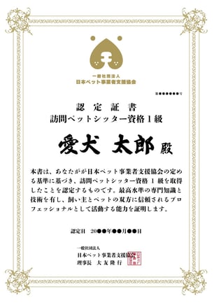 日本ペット事業者支援協会認定証1級 賞状