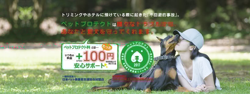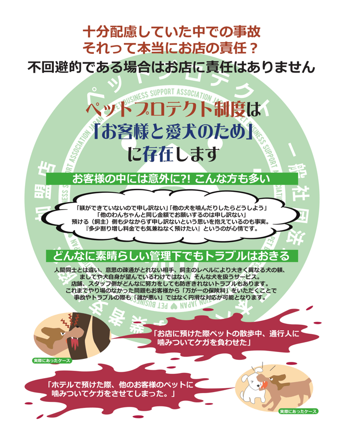 本来、不回避的な事故やトラブルは運営管理者に責任はありません。しかしながら事故やトラブルが起きた際の責任を全てお店側(ショップ、サロン等)が追うケースが大半であるというデータがあります。それは大切なお客様と愛犬を思えば・・・という強い気持ちからなるものです。