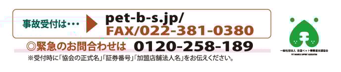 事故が発生した場合には、まず被害者・ペットの救護処置をとり、最寄りの病院及び、必要に応じ、警察署への届け出をするとともに、事故発生の日時、場所および事故の概要等について日本ペット事業者支援協会HP「事故受付Webフォーマット」または、専用FAX用紙にて、後日遅滞なく書面よりご連絡ください。