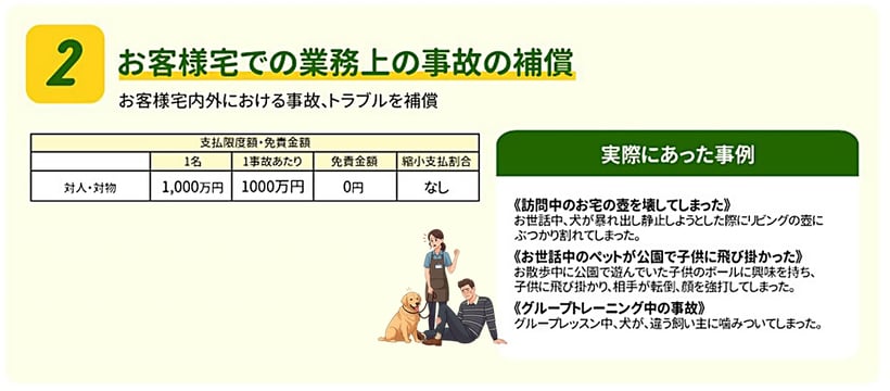 大切なペットのお世話やトレーニングは、責任重大なお仕事です。万が一の事故やトラブルに備えて、安心して業務に専念できる賠償責任保険をご用意しました。