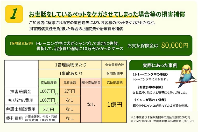 ※ペット事業者向け「施設所有(管理)者賠償責任保険」「受託者賠償責任保険」には、保険契約者または被保険者に代わって事故の相手(被害者)と示談交渉を行う「示談交渉サービス」はありません。賠償事故に関わる被害者との示談交渉・弁護士への法律相談・損害賠償請求権の委任等は必ず引受保険会社とご相談のうえ、お進めください。